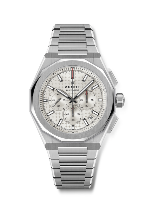 Il cronografo DEFY Skyline con cassa ottagonale in acciaio da 42 mm e lunetta sfaccettata si distingue per il quadrante argentato effetto “soleil”, ispirato all’emblematica stella a quattro punte di ZENITH. Animato dal movimento automatico di manifattura ad alta frequenza El Primero 3600 dotato del primissimo indicatore con precisione al 1/10 di secondo. Bracciale in acciaio intercambiabile e cinturino in caucciù verde con motivo ispirato all’iconica stella ZENITH.