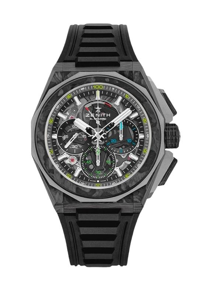 Il cronografo automatico ad alta frequenza DEFY Extreme Carbon, con precisione di lettura al 1/100 di secondo, è realizzato in fibra di carbonio e titanio, un materiale leggero ma resistente. Ispirato ai colori del campionato off-road elettrico EXTREME E, il quadrante in vetro zaffiro rivela il movimento automatico El Primero 21, con due scappamenti che oscillano alla frequenza di 50 Hz e 5 Hz. L’orologio è disponibile con cinturino in caucciù nero o rosso e in Velcro nero.
