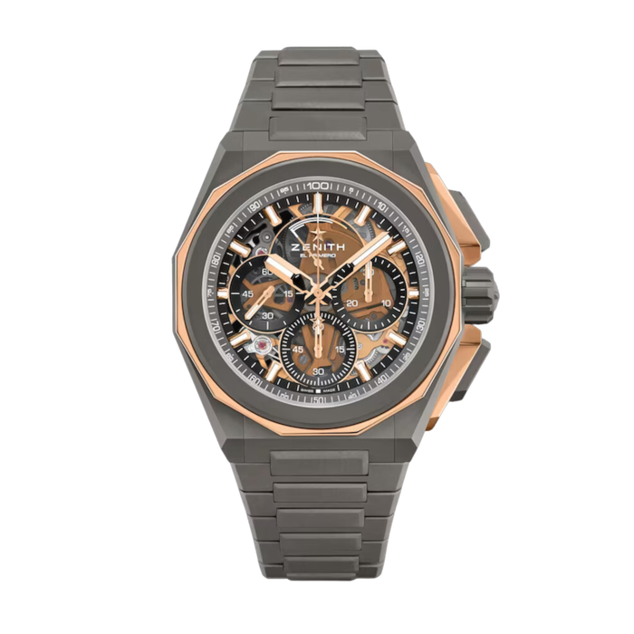 Il cronografo DEFY Extreme con precisione al 1/100 di secondo è realizzato in titanio leggero ma robusto con finitura opaca e dettagli in oro rosa. Il quadrante in vetro zaffiro colorato rivela il movimento cronografico automatico El Primero 21 con due scappamenti. L’orologio è disponibile con bracciale in titanio e cinturini in caucciù e Velcro.