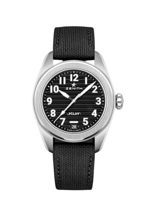 Modello per la nuova generazione di orologi PILOT di ZENITH, il PILOT Automatic vanta una cassa in acciaio da 40 mm con corona sovradimensionata e un quadrante testurizzato nero con numeri arabi luminescenti di grandi dimensioni. Fornito con due cinturini intercambiabili: uno in caucciù nero effetto “Cordura” e uno in pelle di vitello marrone. Animato dal movimento automatico di manifattura ad alta frequenza El Primero 3620. L’orologio è dotato di un secondo cinturino, per sperimentarne appieno l’intercambiabilità.
